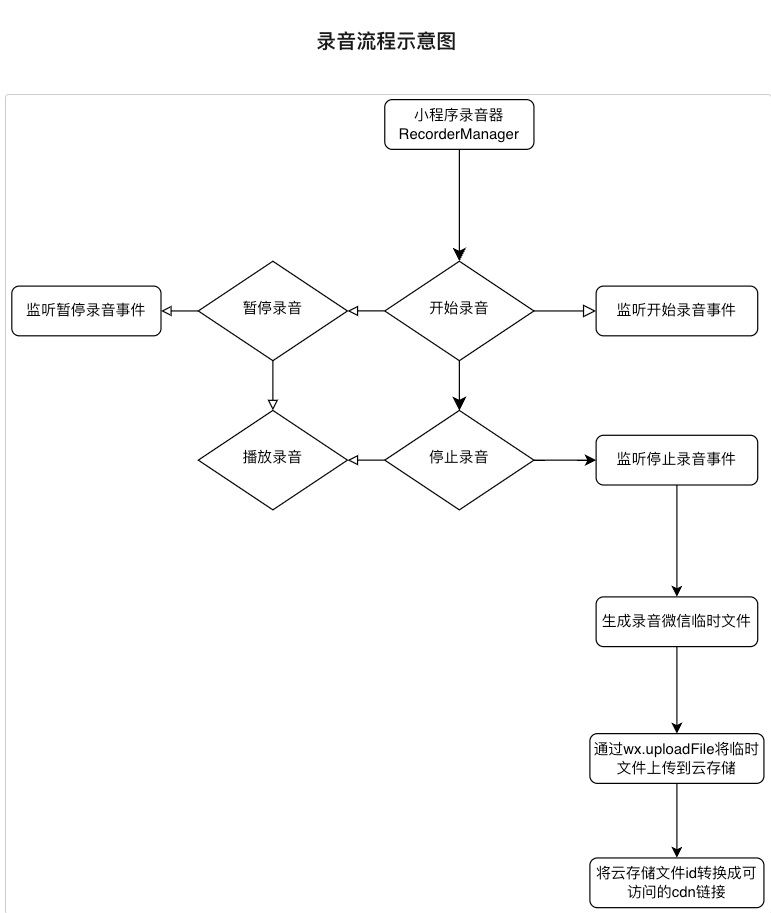 利用小程序 API 中的 RecorderManager 对象(全局唯一的录音管理器)以及相关的录音事件来实现整个录音流程。