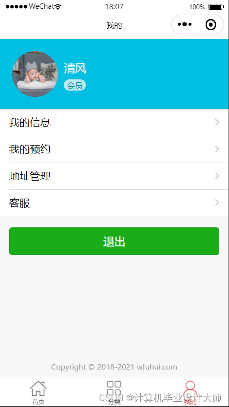 个人中心显示我的信息(可编辑,上传头像),我的预约(包含取消,支付,完成,评价),地址管理(个人地址维护)