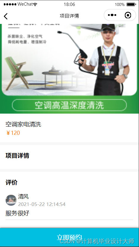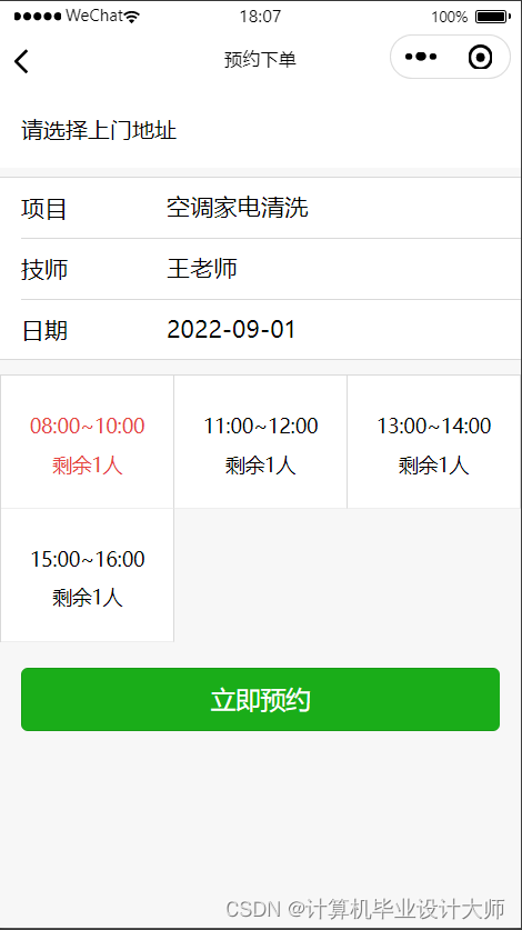 点击项目进入项目详情,可以点击预约下单,下单选择上门时间以及地址