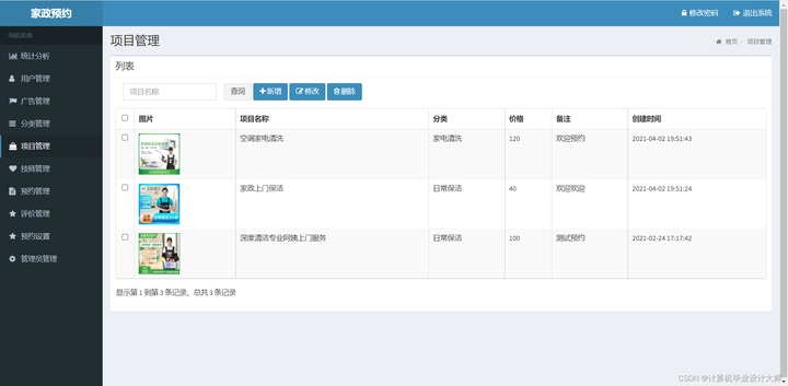 分类管理:项目分类增删改查