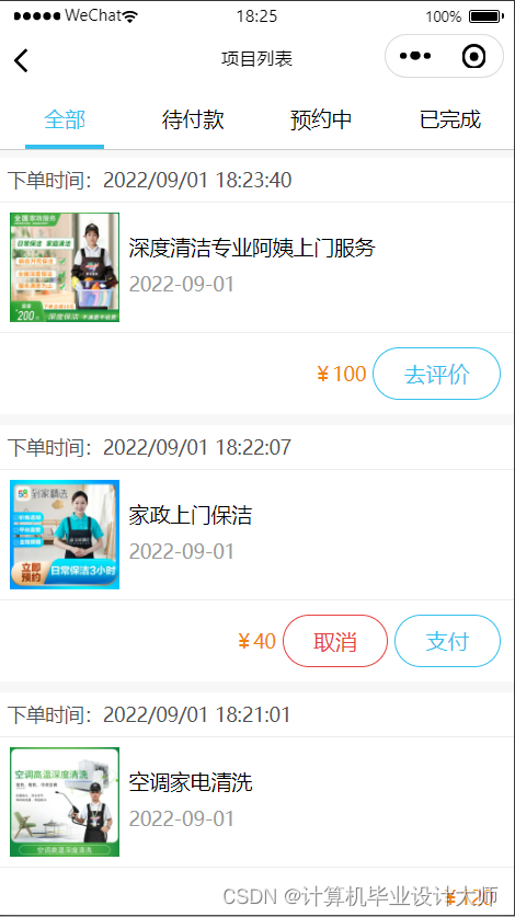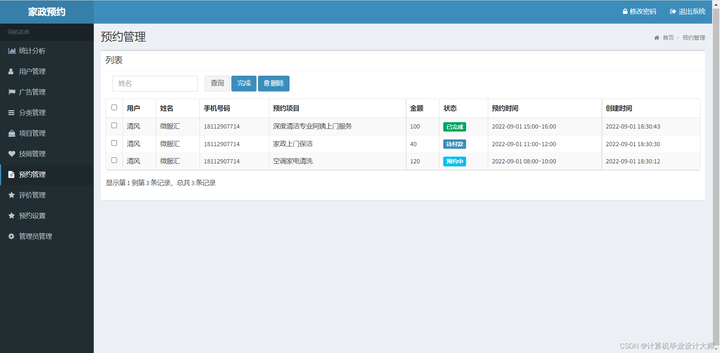 预约管理:显示用户下单信息,以及完成预约