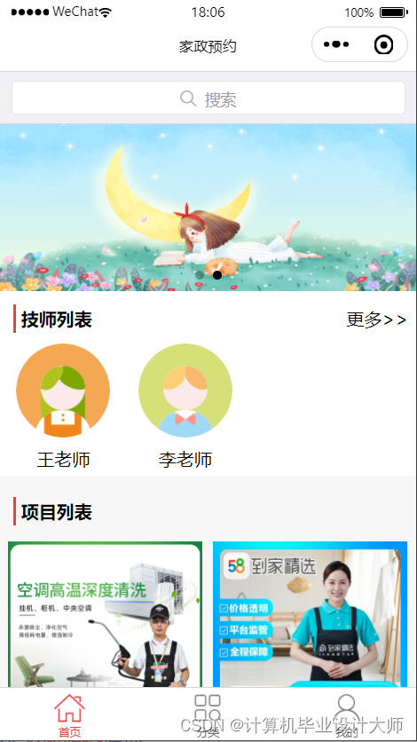 首页显示搜索项目,轮播图,技师列表(点击进入详情介绍),最新上架项目