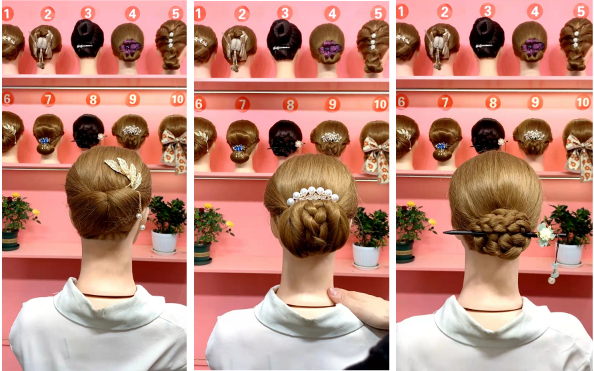 “这个发型简单又大气,如果你头发不是特别厚,可以用我们17号链接水晶棒。”
