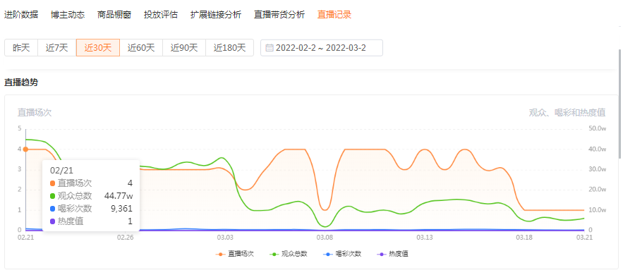 近期账号每日直播次数有所下降,在【直播记录】-【直播趋势】中可以看出近30天,一天最多直播4场,最少1场。