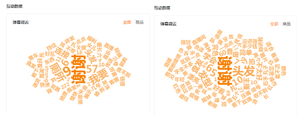 在【直播监控】的2场直播中,可以看到“谢谢”一词在弹幕区占比较高,因为经常有用户要求,比如“麻烦8号教下,谢谢”。有时应用户要求,一个发型主播要重复无数次。