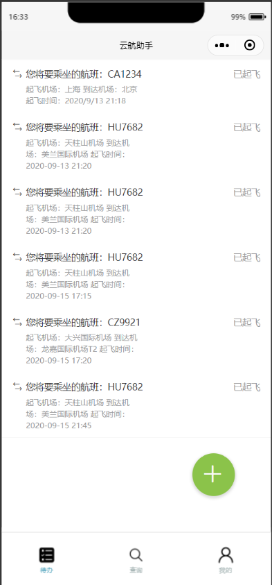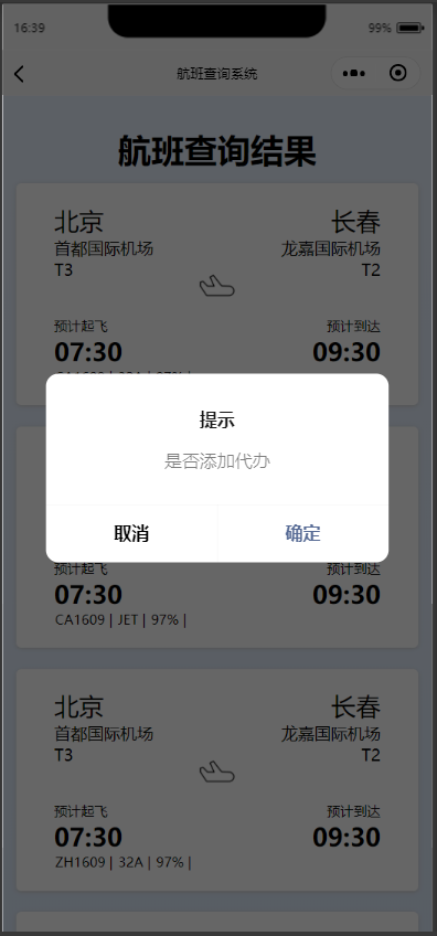 航班查询结果界面(长按可添加代办)