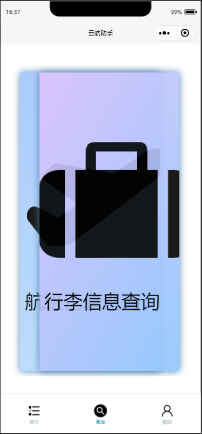 云航助手是为航班旅客提供出发前相关服务而创作的一个小程序,他不仅为旅客提供了添加代办,订阅消息等功能,还提供了航班查询、行李查询等信息查询功能,旨在为旅客的航空出行方式提供更为便捷的一体化服务,查询的同时实现添加代办,帮助旅客更加方便地管理自己的计划,同时还会定时发送消息提醒用户以防用户错过重要行程。