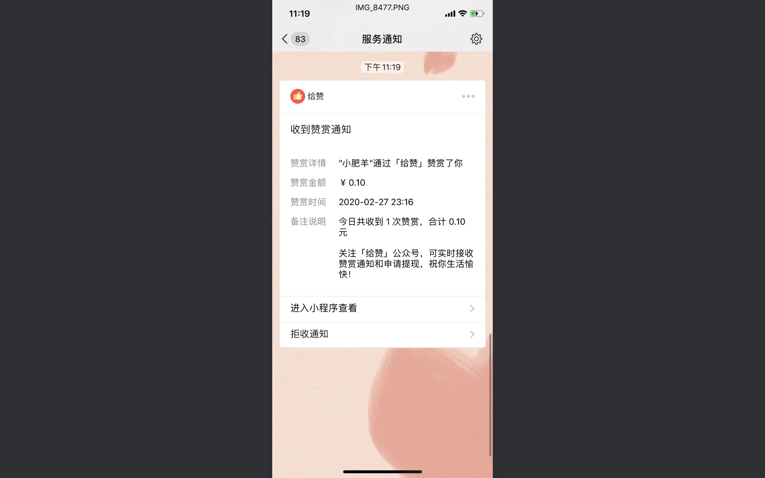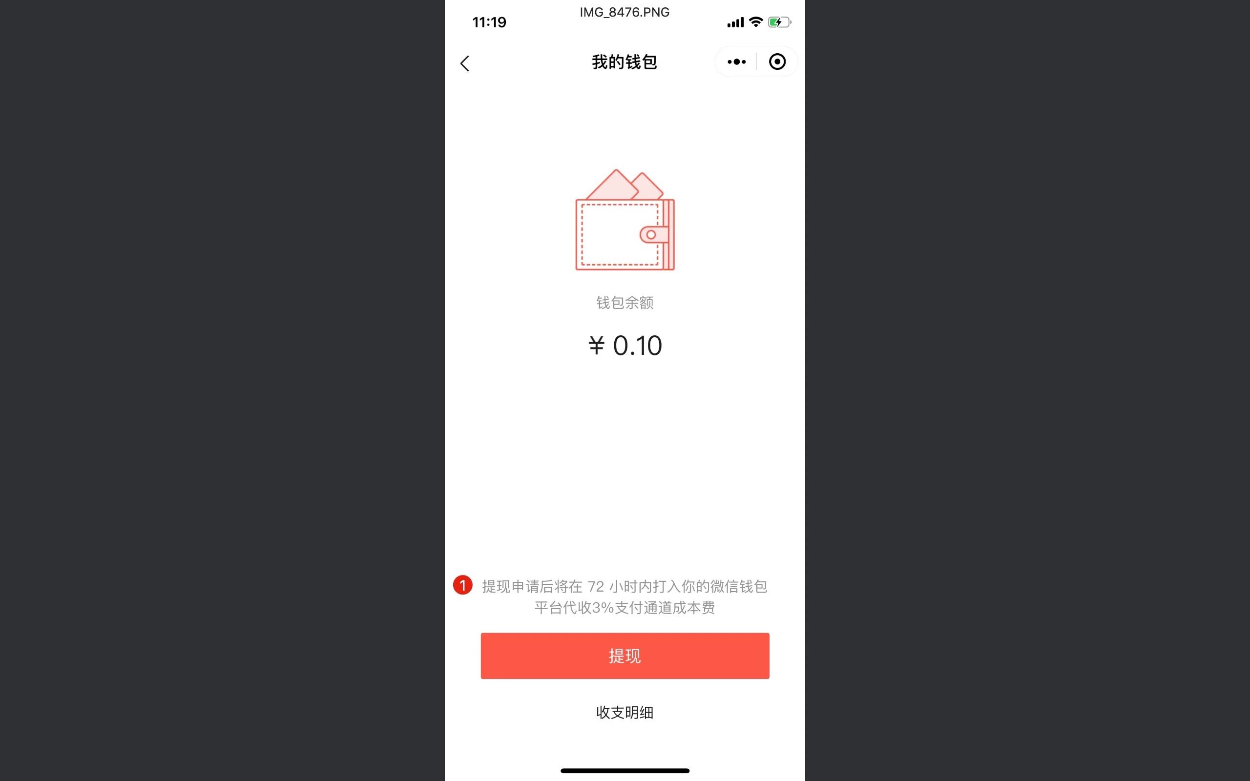 😊需要说明的是:通过开发者个人打赏码进行打赏,赏金100%实时到账,而通过给赞小程序不是实时到账,需要自己提现,而且提现环境涉及微信企业支付,微信方面需要扣掉千分之6的费用,最终给赞小程序最终代收3%的费用,也就是最终打赏到账97%。
