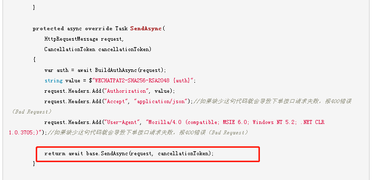 request.Headers.Add("User-Agent", "Mozilla/4.0 (compatible; MSIE 6.0; Windows NT 5.2; .NET CLR 1.0.3705;)");//如果缺少这句代码就会导致下单接口请求失败,报400错误(Bad Request)
