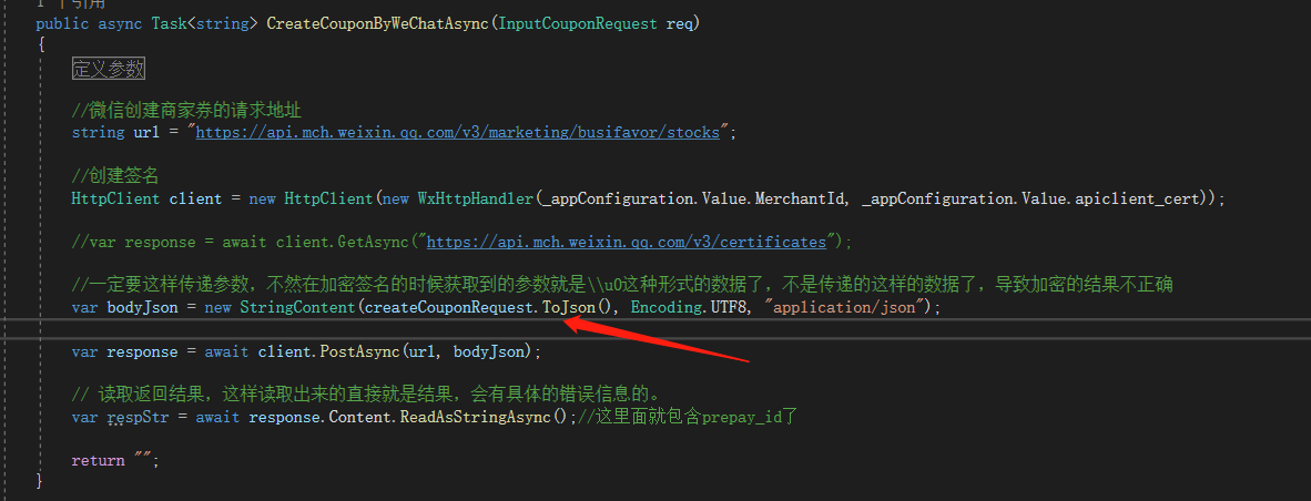 var bodyJson = new StringContent(req.ToJson(), Encoding.UTF8, "application/json"); //一定要这样传递参数,不然在加密签名的时候获取到的参数就是\\u0这种形式的数据了,不是传递的这样的数据了,导致加密的结果不正确