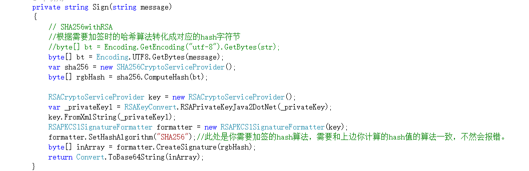 return Convert.ToBase64String(rsa.SignData(data, HashAlgorithmName.SHA256, RSASignaturePadding.Pkcs1));