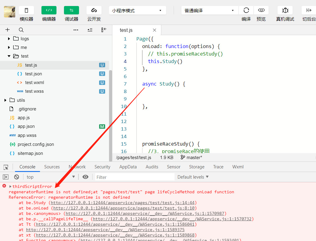 这个报错就是告诉我们不能在小程序里直接使用es7的async和await语法.但是这么好的语法我们用起来确实显得代码整洁,逼格高.