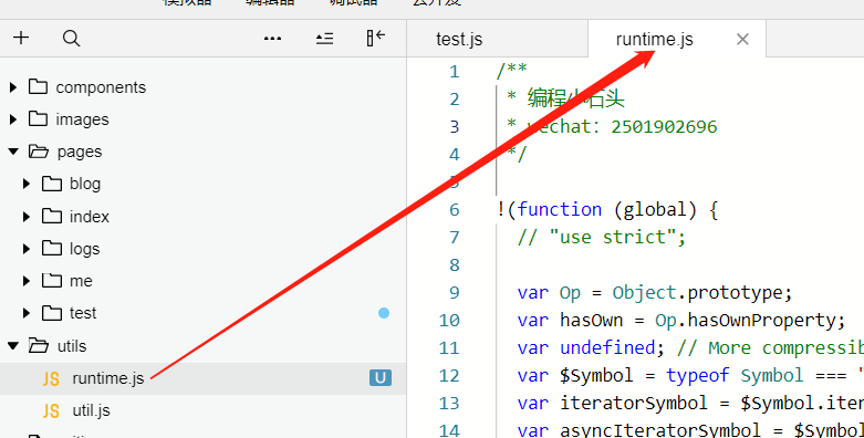 我这里把runtime.js放到我的utils目录下,如果你没有utils目录,可以新建.