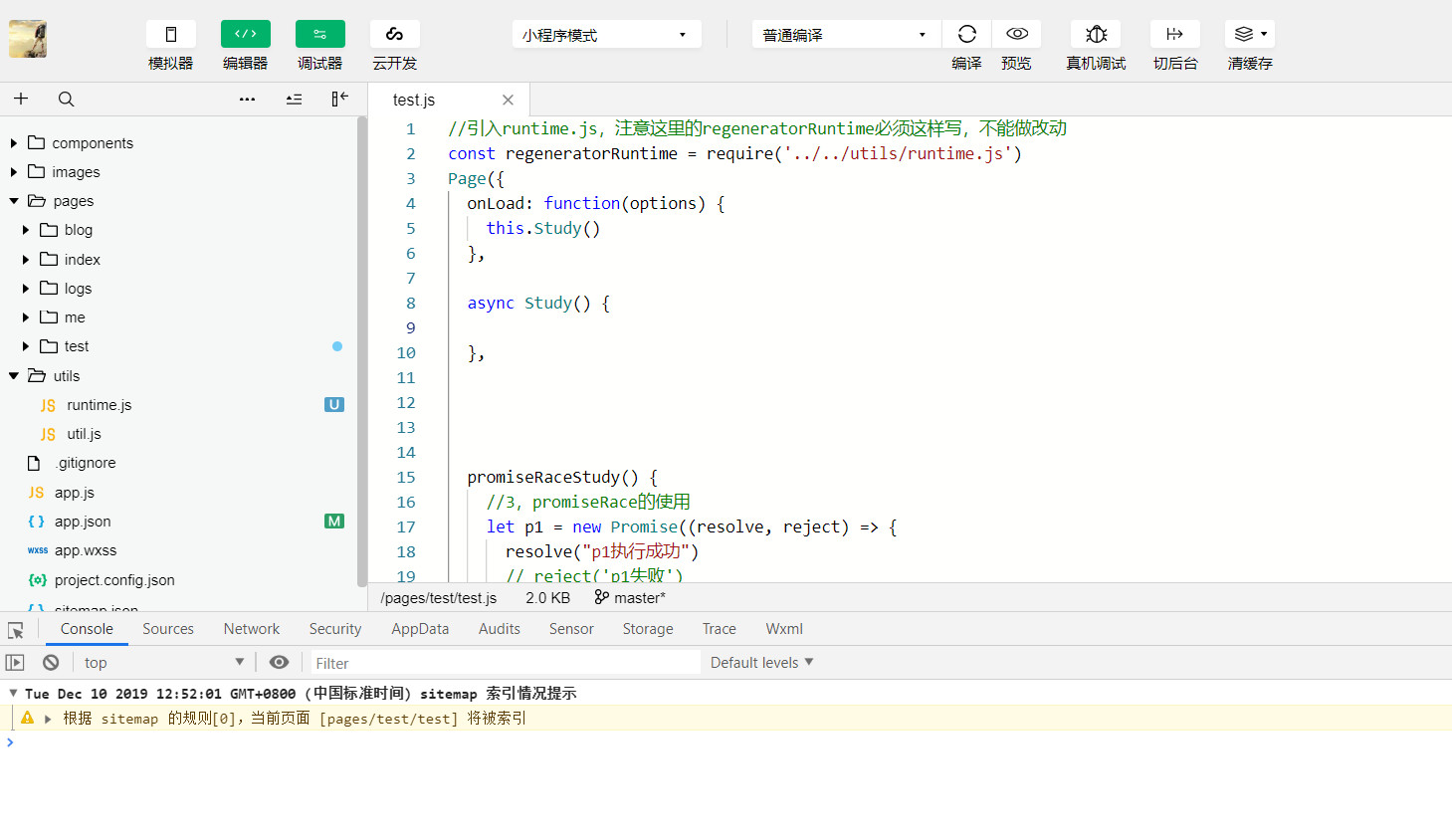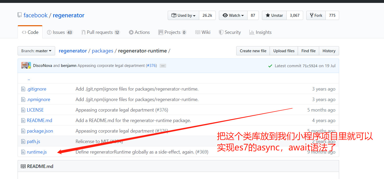 其实这个问题,一些大厂已经给出了解决方案.如上图,我们只需要把facebook出的这个runtime.js类库下载下来,然后放到我们的小程序项目里.