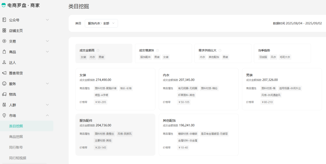 微信小店电脑端-店铺数据-电商罗盘-市场-类目挖掘/商品挖掘,查看相关平台热销品类、对应属性详情,和平台热搜但供给较少搜索词。