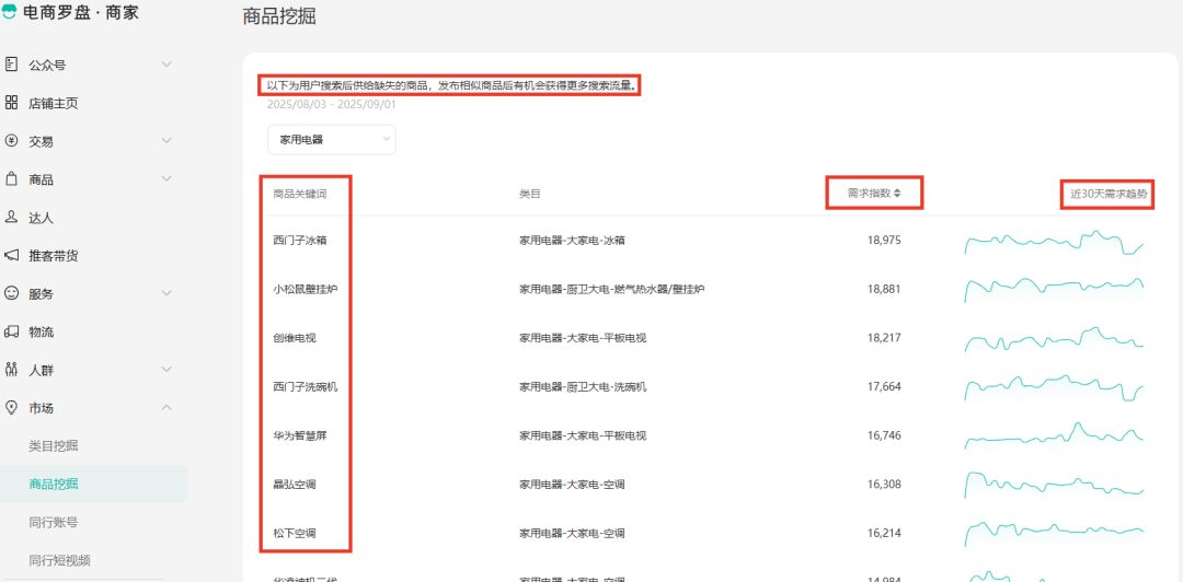 以家用电器为例,通过近30天需求走势图和需求指数2个数据,商家可了解该商品的热度。