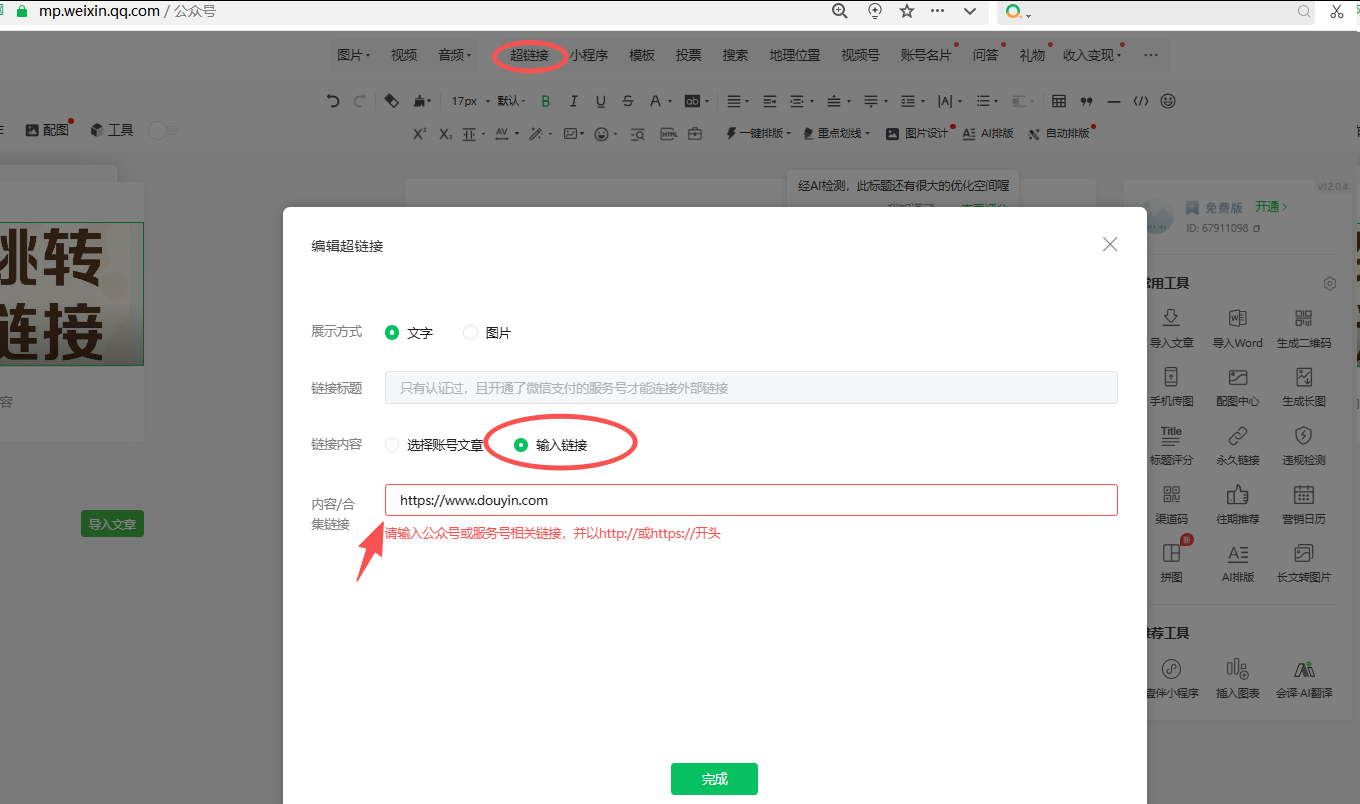 编辑文章内容,选定文字设置外部连接时,如上图显示只能连接公众号相关连接,故:如果不是开通支付功能的公众号,文章里是跳转不了外部链接的。