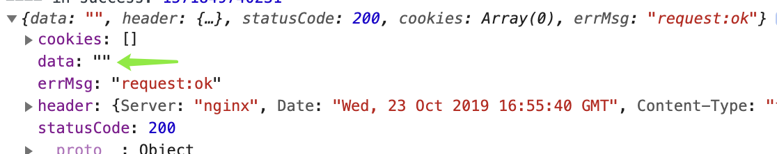 我一遍又一遍的点击着小程序开发者工具的编译按钮,发现在我点击十次之内,一定会出现重发多个请求后,有一个请求得到响应,其他请求被取消,而在success中打印res,发现里面的data不见了,就是下面这样👇