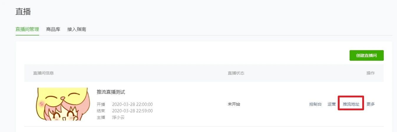 创建在直播间管理位置找到刚创建的直播间,后面会出现 【推流地址】
