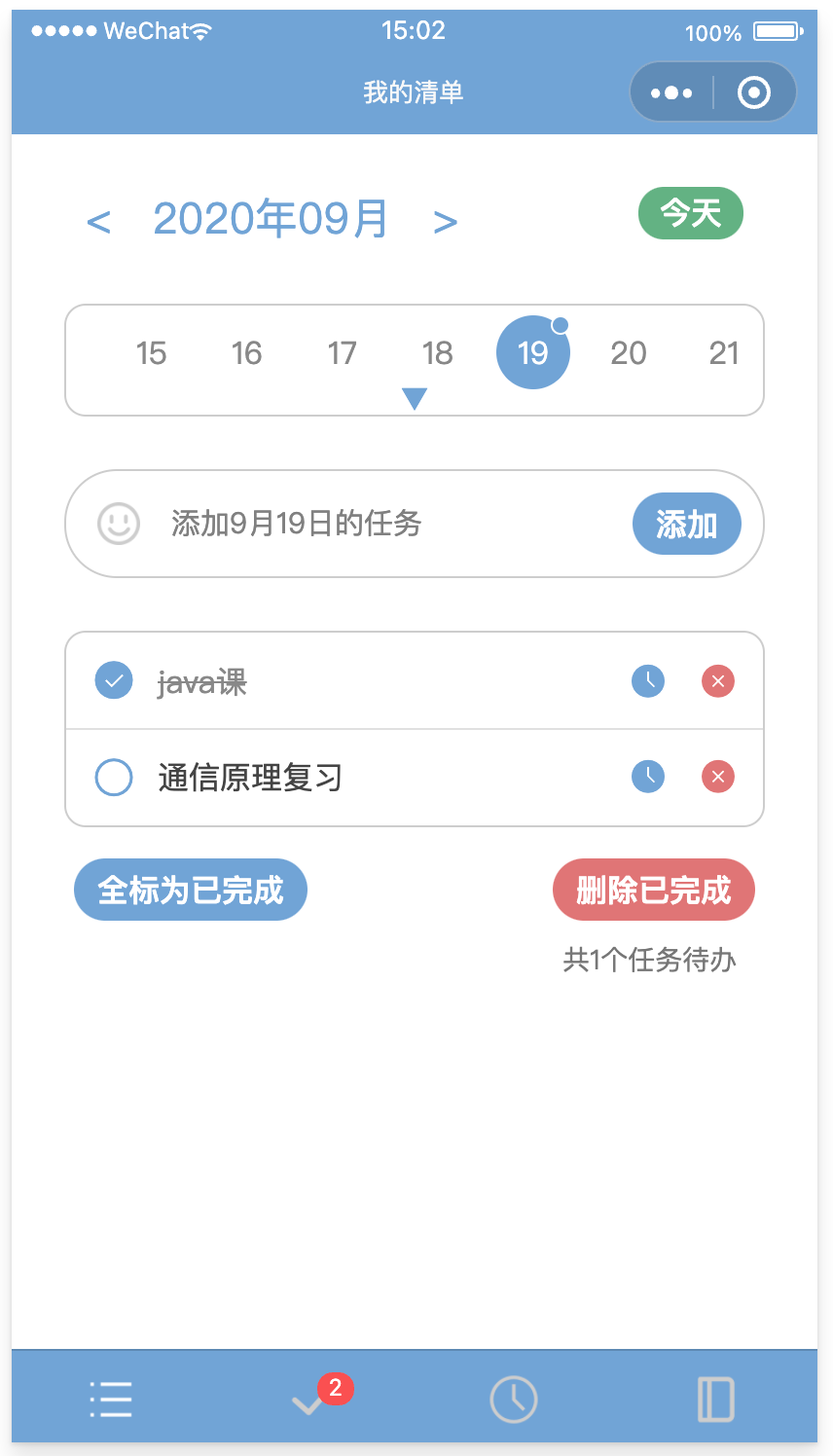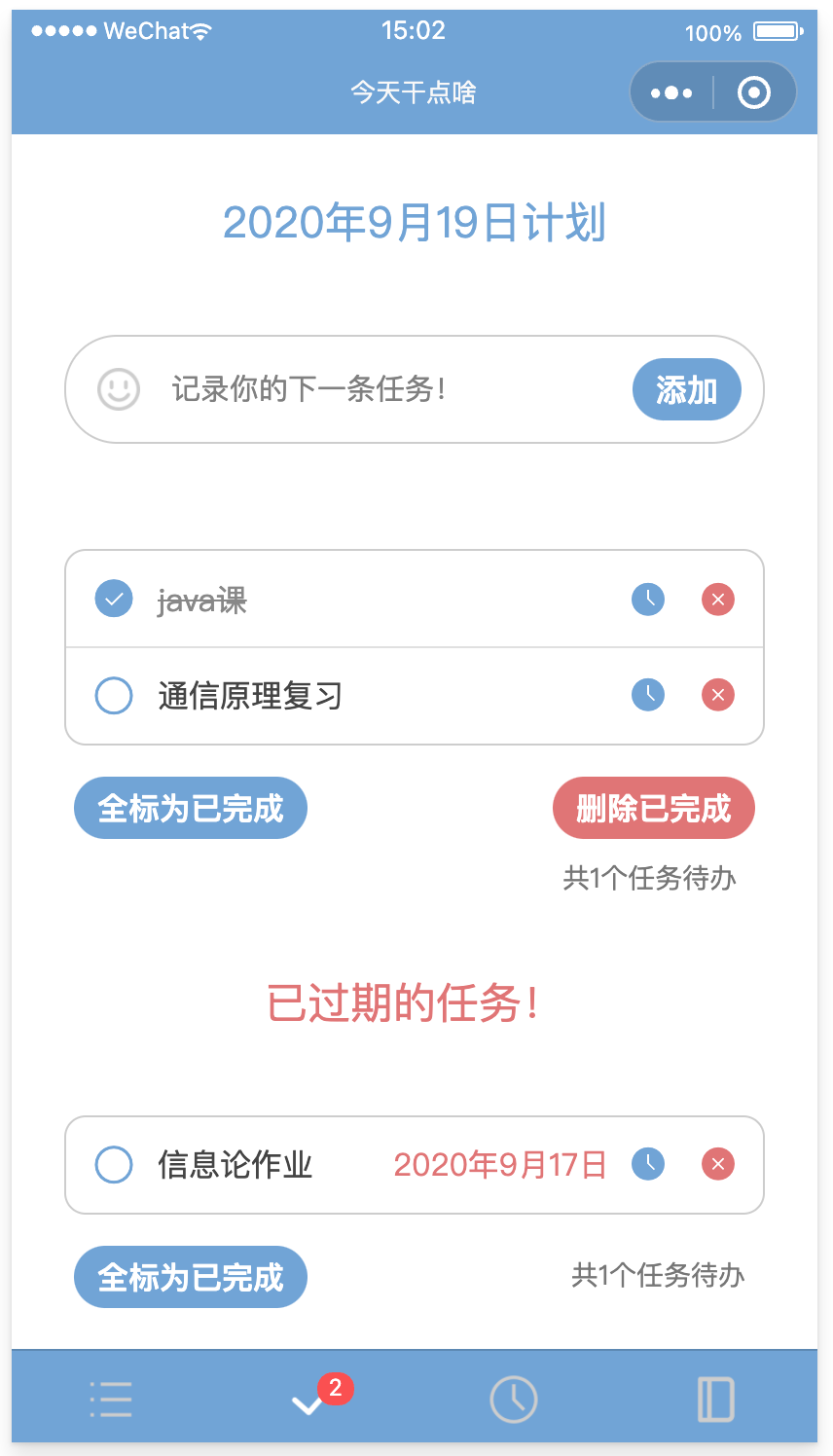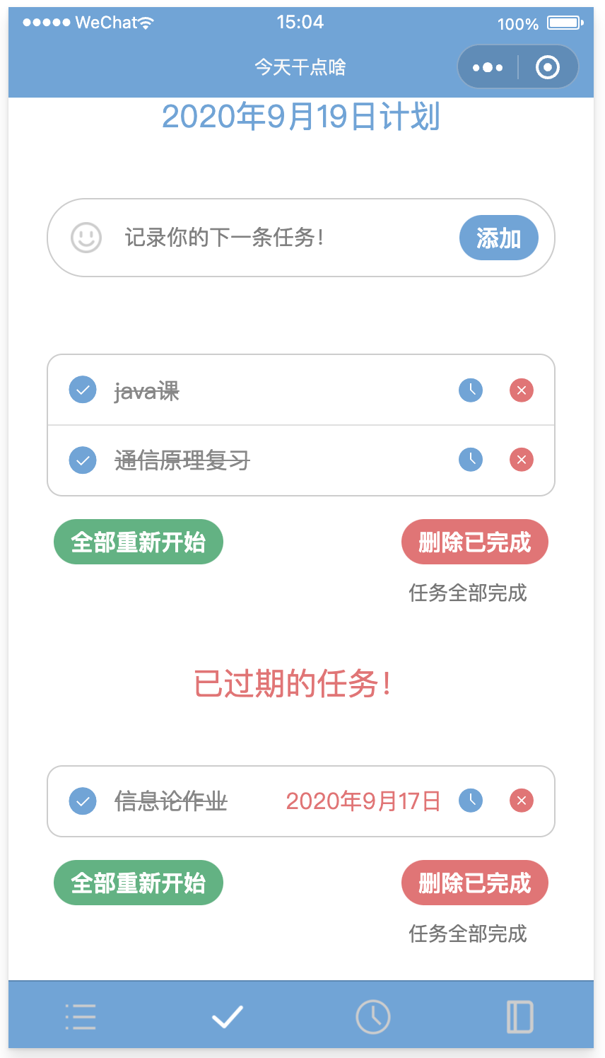 今日清单页面展示截止到当天的所有任务,过期的和今日待办任务分开显示,每一栏任务都有完成按钮、日期更改按钮和删除按钮。过期任务会显示任务的日期。底部的按钮可以进行全局操作。最底部的tabbar则显示今日共有多少任务待办。