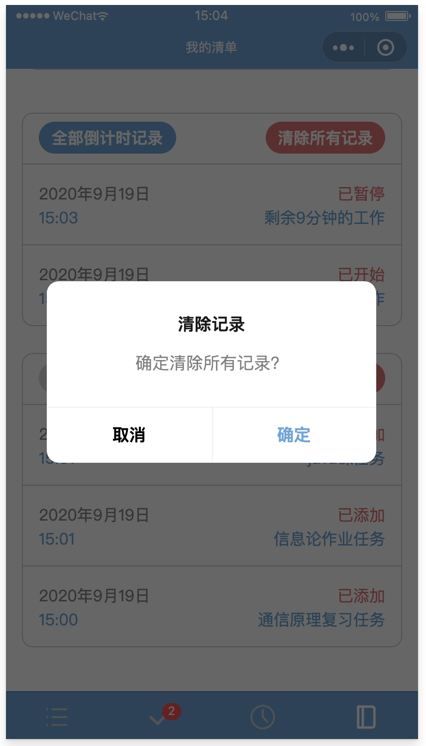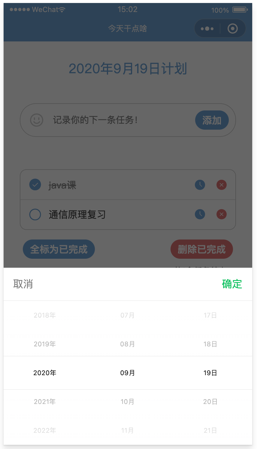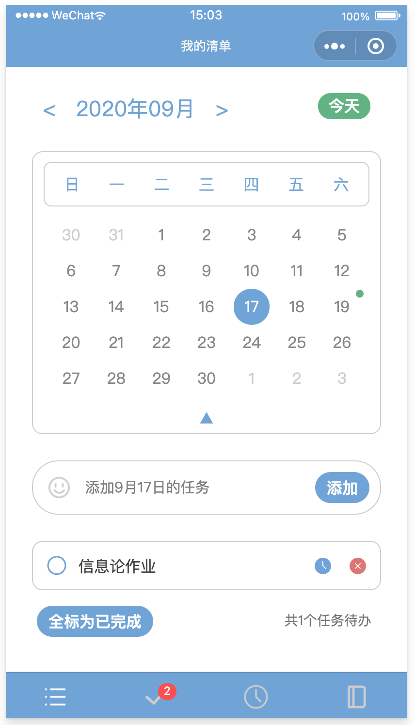 今日清单页面展示截止到当天的所有任务,过期的和今日待办任务分开显示,每一栏任务都有完成按钮、日期更改按钮和删除按钮。过期任务会显示任务的日期。底部的按钮可以进行全局操作。最底部的tabbar则显示今日共有多少任务待办。