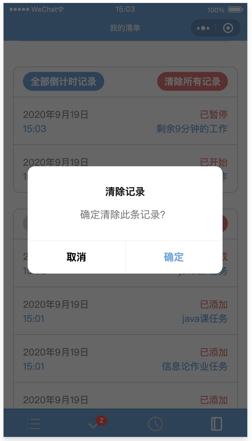 在历史记录页面,可以查看自己的任务增删记录和计时记录。点击“全部”按钮可以显示出所有的记录。