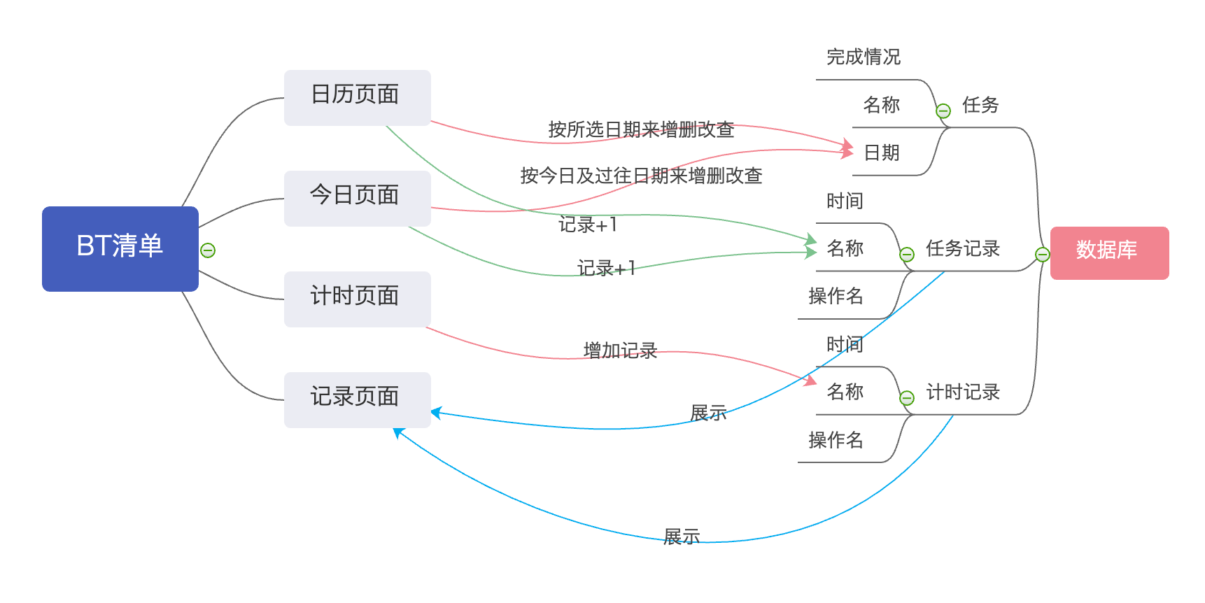 BT清单以todos功能为基础,扩展出了日历、计时,与历史记录界面。今日记录与日历的数据互通,与计时器的数据独立,最终所有的操作记录展示在历史记录界面中。