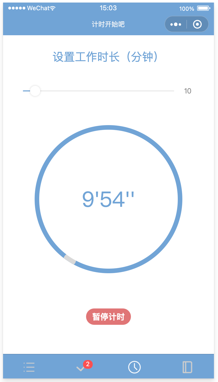 计时页面可以拖动上方的滑块来调节倒计时时长,开始计时后,中间的动画效果开始播放,灰色小球会每秒不匀速转动,计时结束后,动画停止。