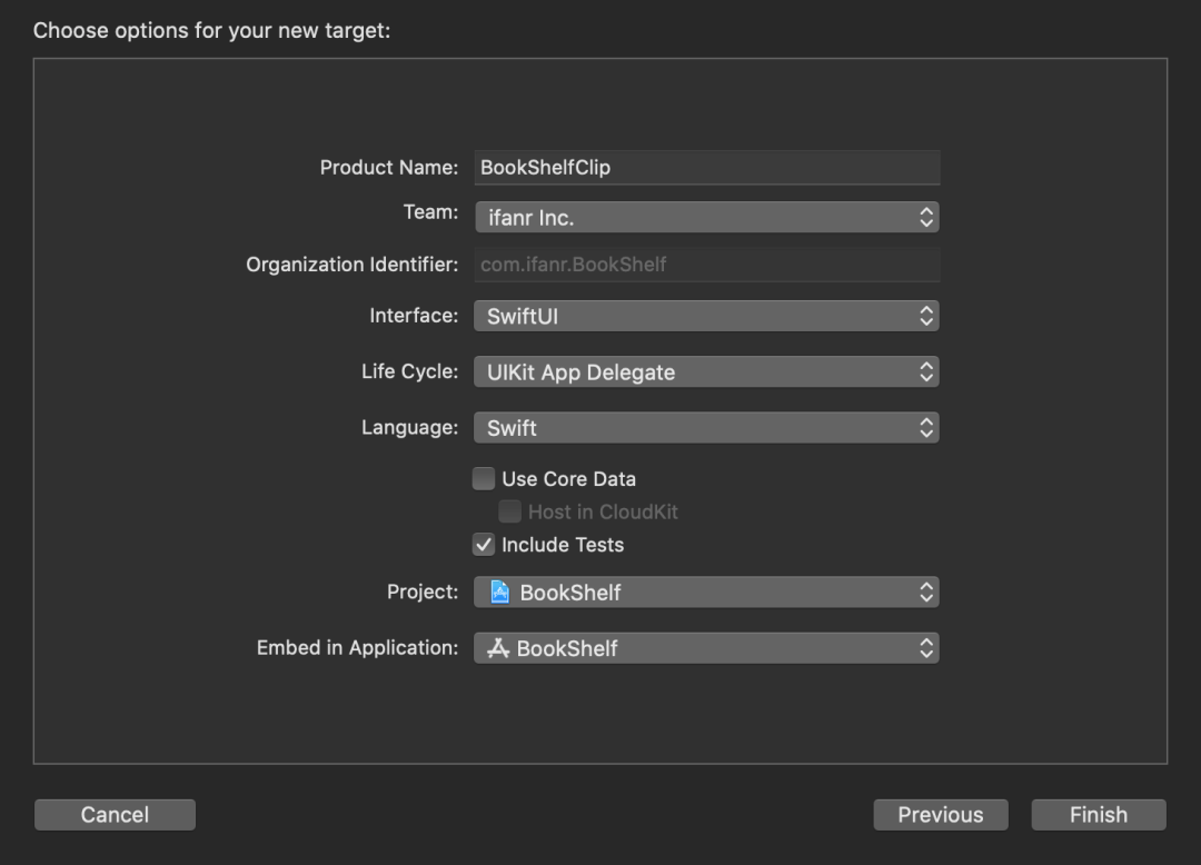 BooKShelfClip的默认identifier以原始target identifier作为前缀,后面加上.Clip。在BookShelfClip Target中identifier为com.ifanr.BookShelf.Clip。