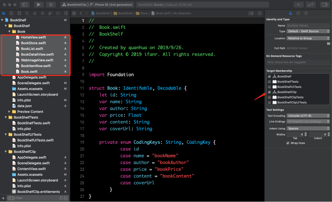 HomeView 从哪里来的呢?这就是 App Clip 开发上的便利:可以不写代码。通过和原始 Target: BookShelf 共享文件,BookShelfClip 可以直接使用 BookShelf 中已经写好的 HomeView,如下图: