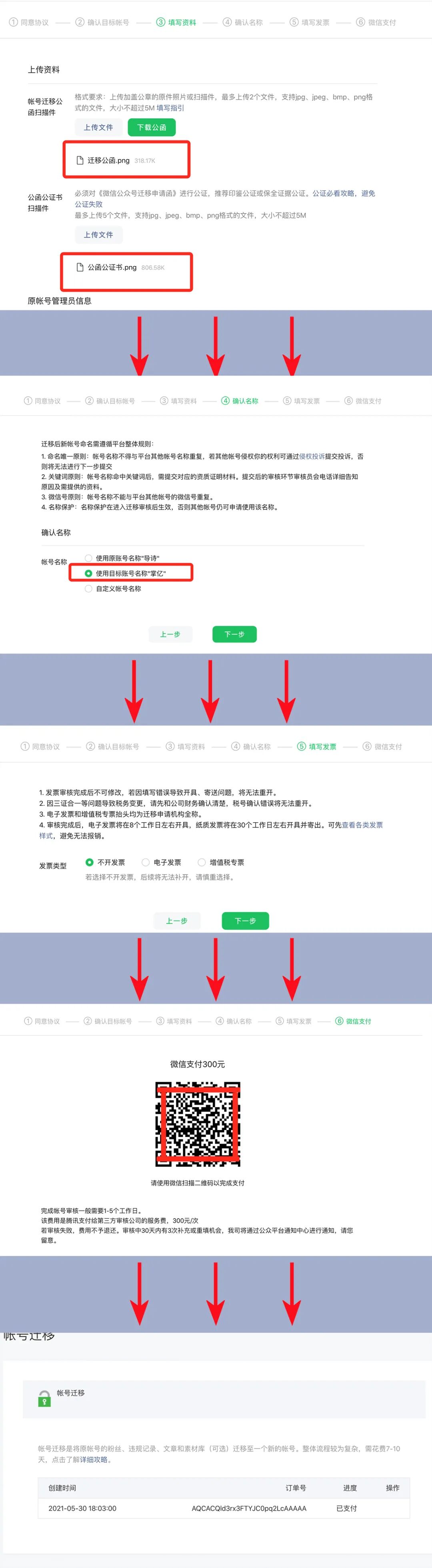 为了不浪费朋友时间,我直接把他的管理员转移给我微信小号了,方便我来回各种扫码。进入主题,开始迁移公众号,先看官方流程图:
