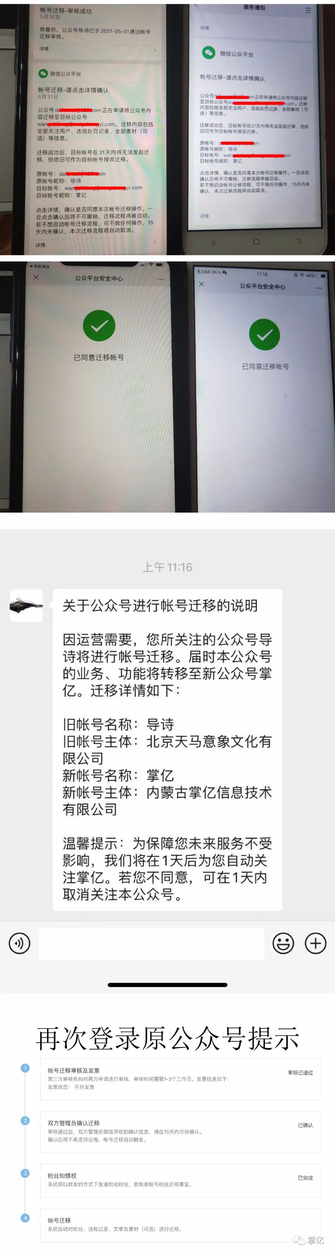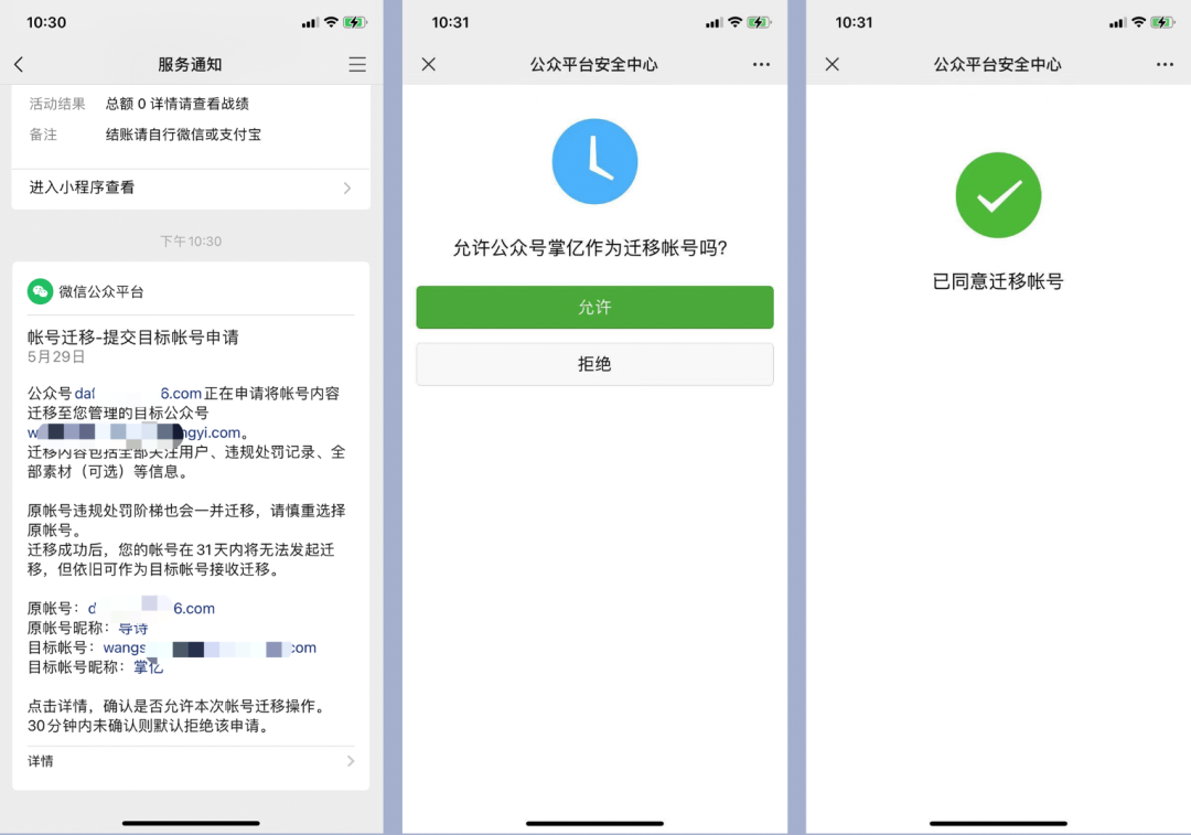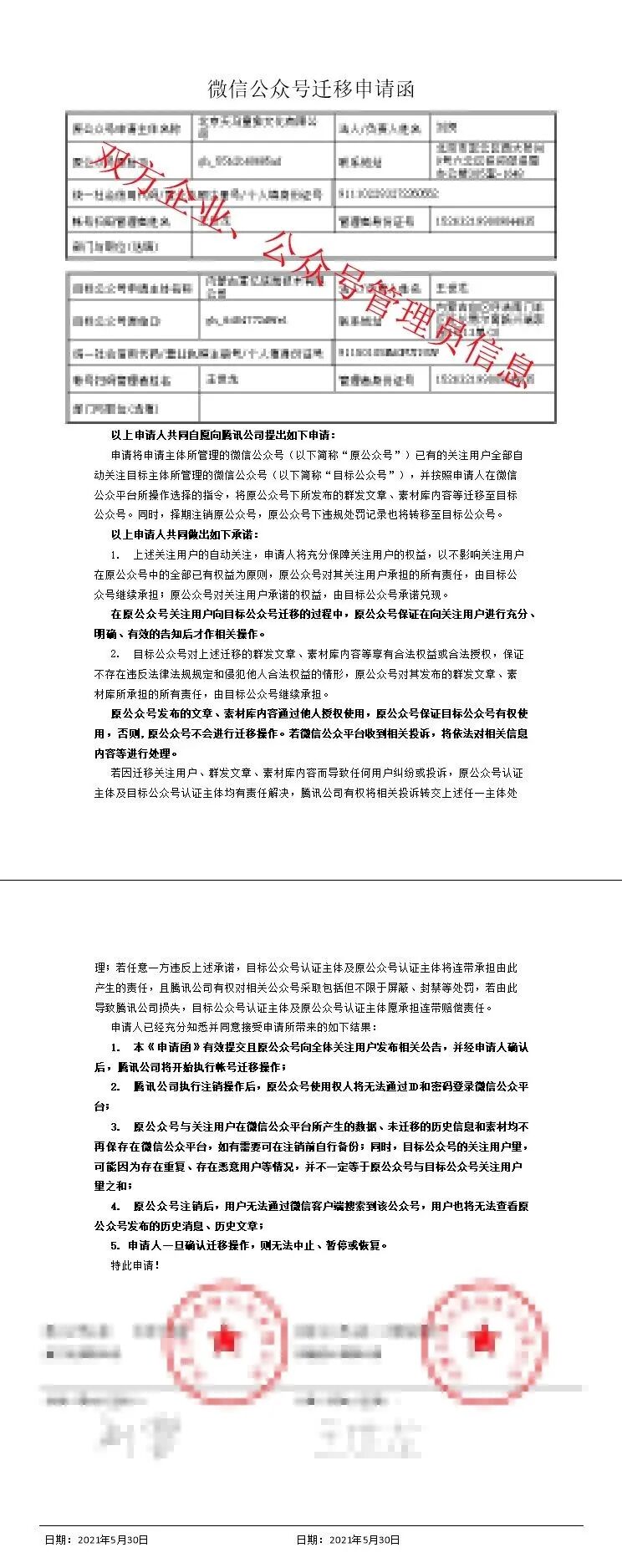 然后我们等着就好了,一般情况2、3天(工作日)就搞定了,期间会打电话确认,然后双方公众号管理员同意迁移,约1个工作日迁移成功。