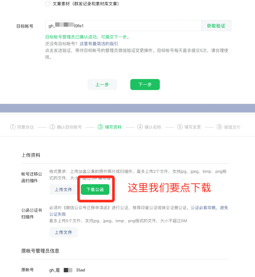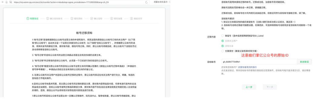 继续准备资料办理公证书:原公众号营业执照、原公众号后台截图、原法人身份证正反面、目标公众号营业执照、目标公众号后台截图、目标法人身份证正反面,公众号后台截图。