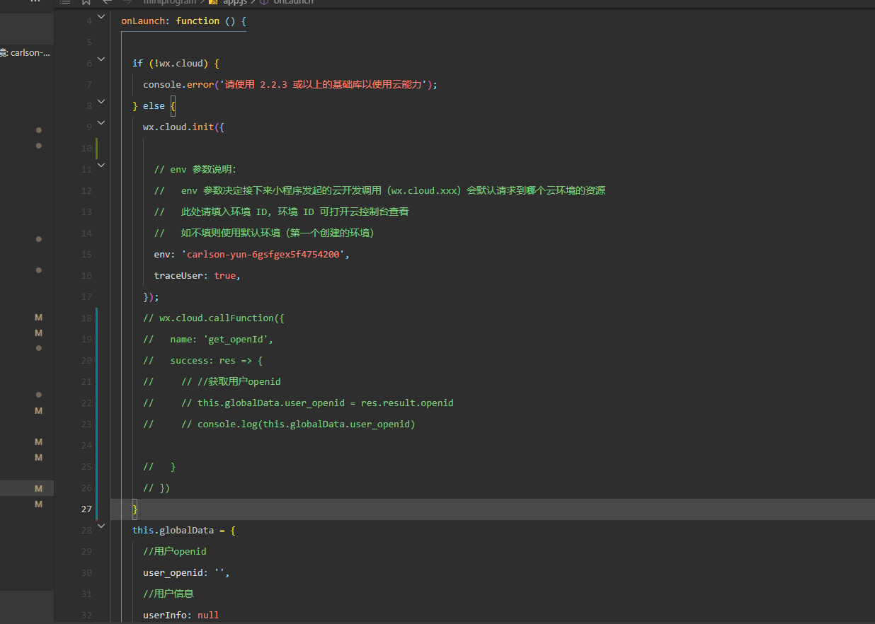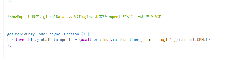 //如果担心openid的安全,就用这个函数 getCloudOpenid: async function () { return this.openid = this.openid || (await wx.cloud.callFunction({name: 'login'})).result.OPENID }, //最佳方案。 getOpenid: async function () { (this.openid = this.openid || wx.getStorageSync('openid')) || wx.setStorageSync('openid', await this.getCloudOpenid()) return this.openid },老哥,这段代码放在app.js哪里啊 ,新人不太懂
