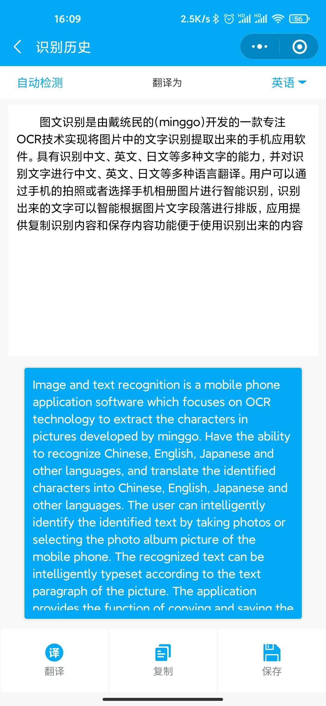具有识别中文、英文、日文等多种文字的能力,并对识别文字进行中文、英文、日文等多种语言翻译。用户可以通过拍照或者选择手机相册图片进行智能识别,识别出来的文字可以智能根据图片文字段落进行排版,整理成笔记。