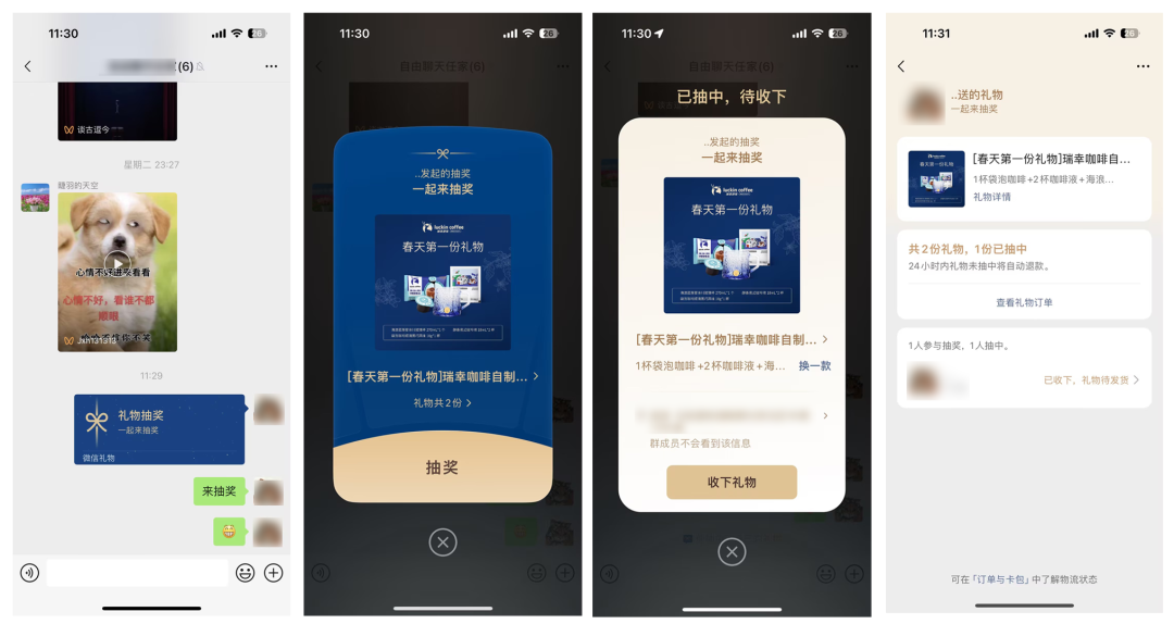群抽礼物流程:群内点击抽奖-抽中后收下礼物-在“订单与卡包”中查看物流状态。