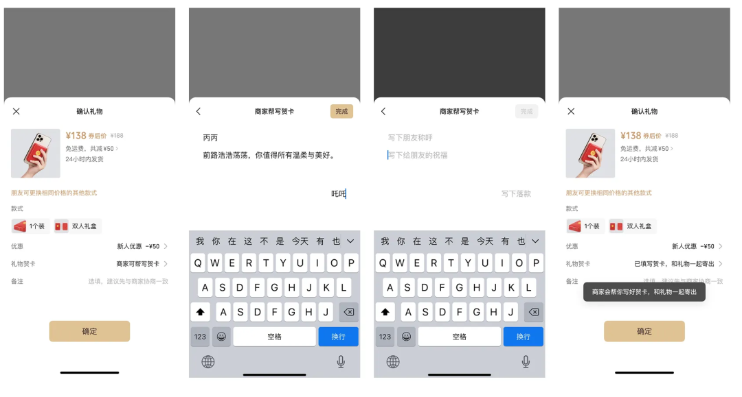 送礼者可以通过「确认礼物 > 礼物贺卡」填写贺卡内容,在「订单详情页 > 礼物贺卡」中可以回溯自己填写的礼物贺卡内容。