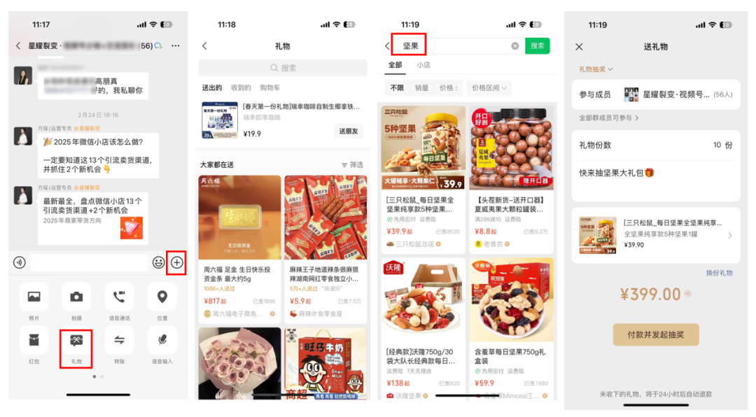 “送礼物”功能允许用户像发送红包一样,直接在聊天窗口赠送实物商品,用户填写地址后成功收下礼物,形成“社交分享→电商交易”的闭环。