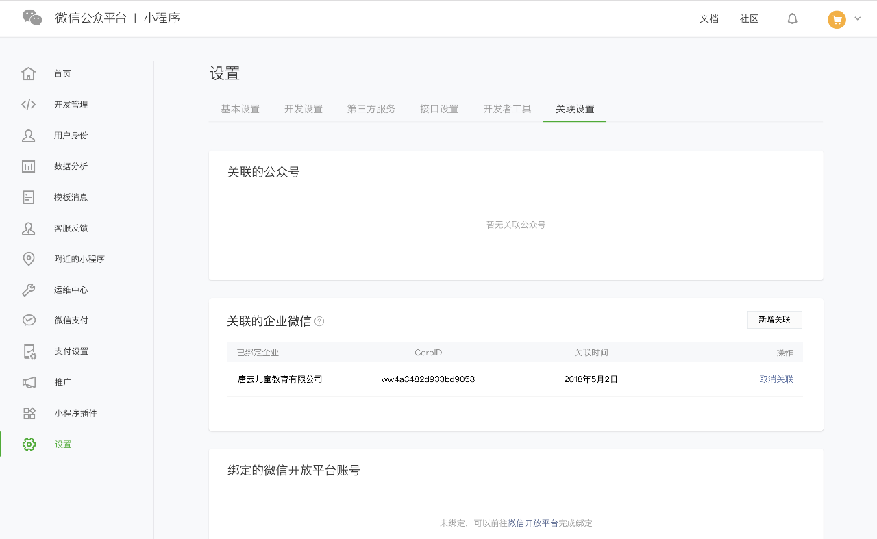 注: 小程序被关联到了哪些企业,可以统一在小程序后台设置-关联设置-关联到企业微信中看到关联记录。