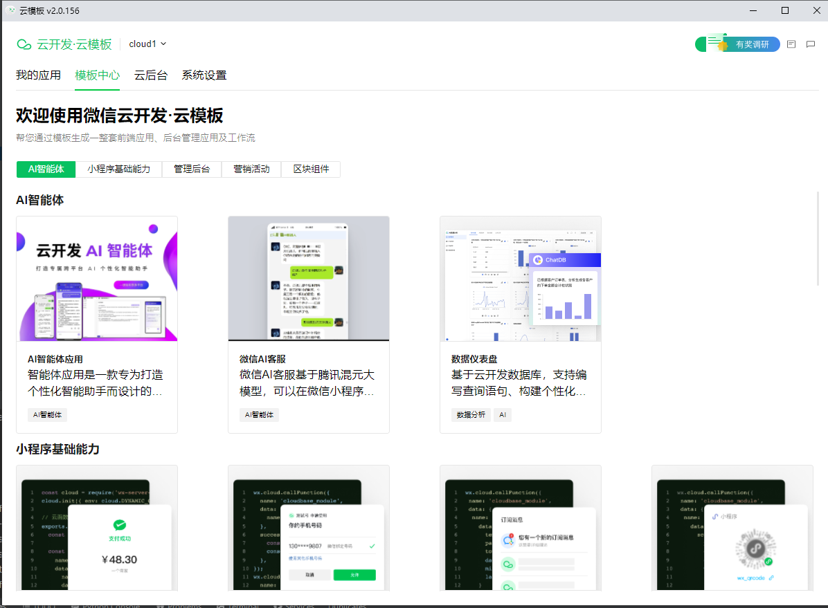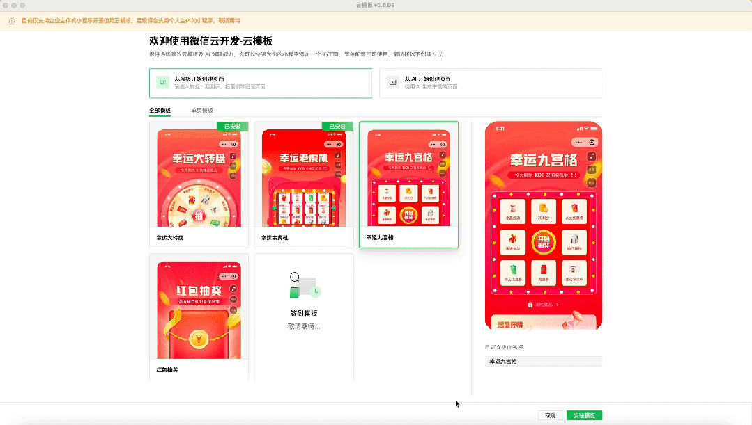 云模板是在微信小程序开放的快速搭建能力,为开发者提供了众多常用的业务模块,只需选择所需模块或通过AI生成模块并进行简单调整,即可直接将源码页面部署到小程序包中,实现活动的快速开发和上线。