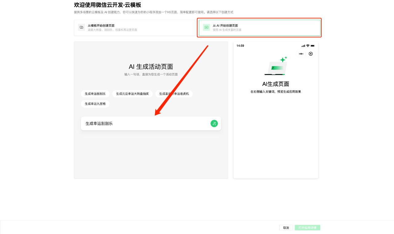 基于这个命题,微信小程序在云模版中推出了基于AI生成页面的能力。