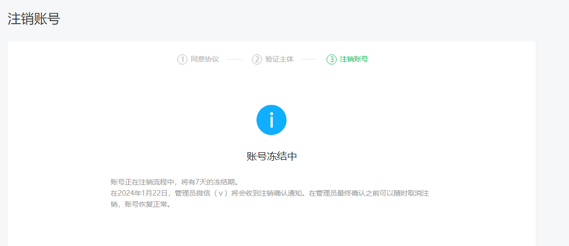 3.选择注销后,会有7天的冻结期,期间还可撤回。