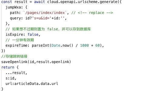 云函数端代码同样采用了官方示例代码,增加了openlink 入库绑定对应文章链接与加密参数,免得多次生成浪费!