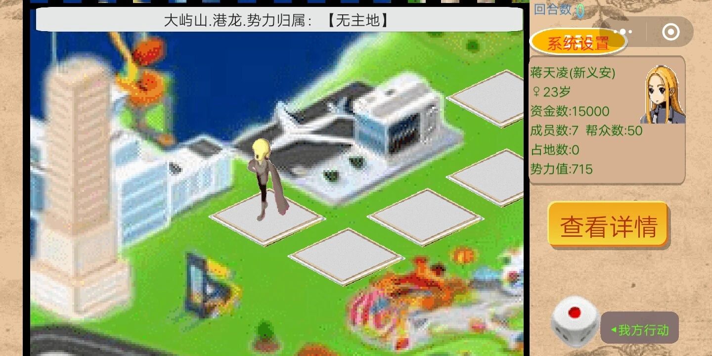 占地 在城市场景地形上由许多分布的“移动格”构成行动路线,移动格分公有地形与私有地形,公有地形分别为“医院”“监狱”“黑市”及“码头”,这些不能被帮派势力占据; 私有地形最初是空地,当角色(帮派势力话事人)走到该处即占据该地盘,同时该处显示本帮派代表颜色、并于每回合后收取少量金钱,若期间别的势力角色停留该处则立刻易主。