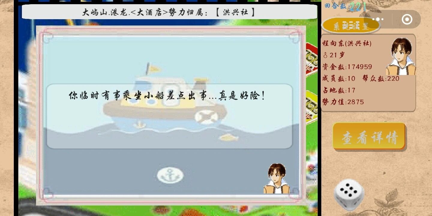 除此之外,在某些移动路线会经历乘船渡海情景,此时随机触发“解救”或天气异常而增加或损失帮众小弟的事件。