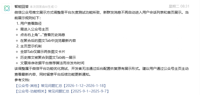 你好,在公众号接入/使用过程中遇到疑问,可以在 公众号专区-选择「提问」进行发帖提问,平台会流转到相关业务同学协助解答。若选择「写文章」后发布非文章类内容,将会被平台隐藏处理。