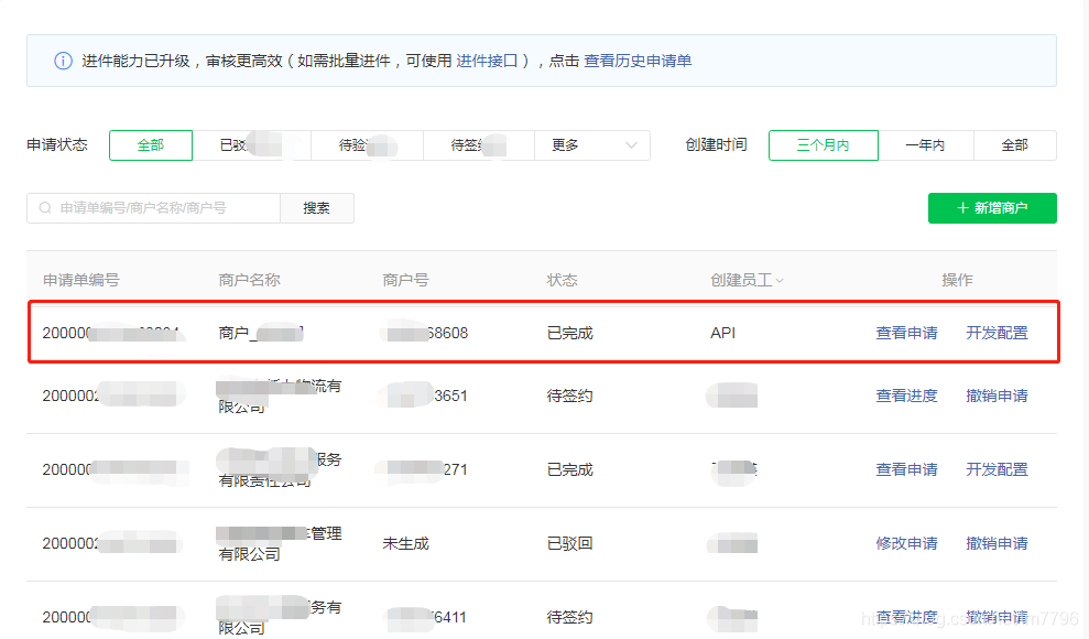 就表示进件成功了,我们登陆到商户平台看看。创建员工=API的就是刚才我们申请成功的。