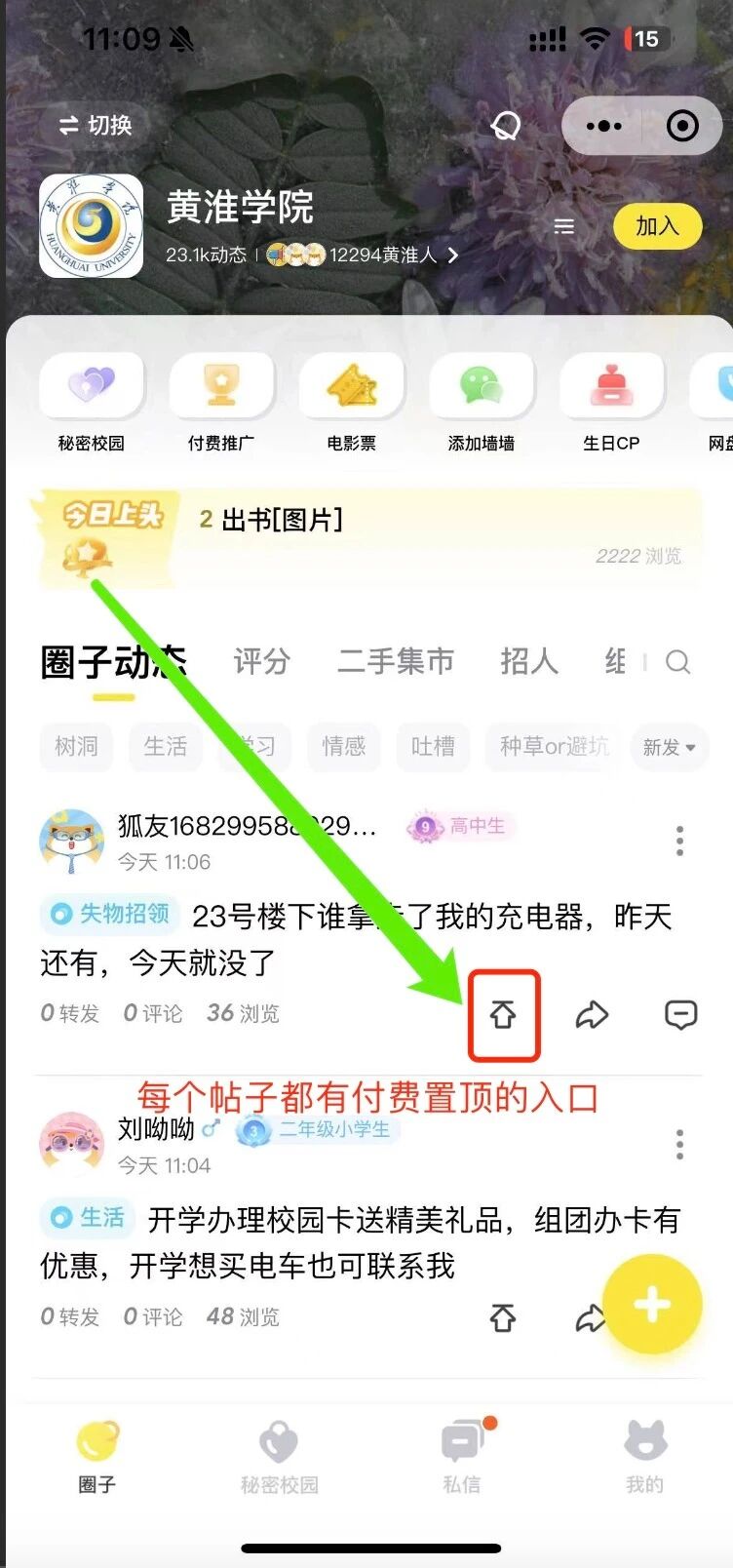 搜索圈子:黄淮学院,有明显的帖子付费置顶,直接调起微信支付