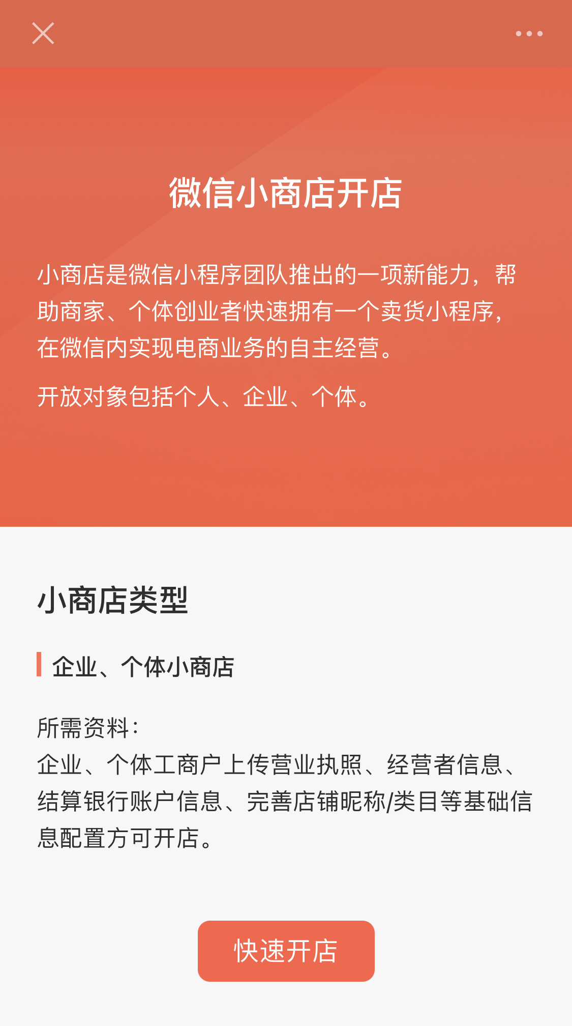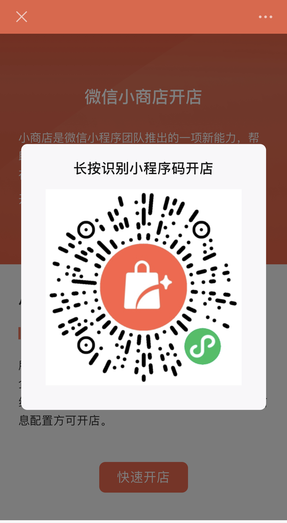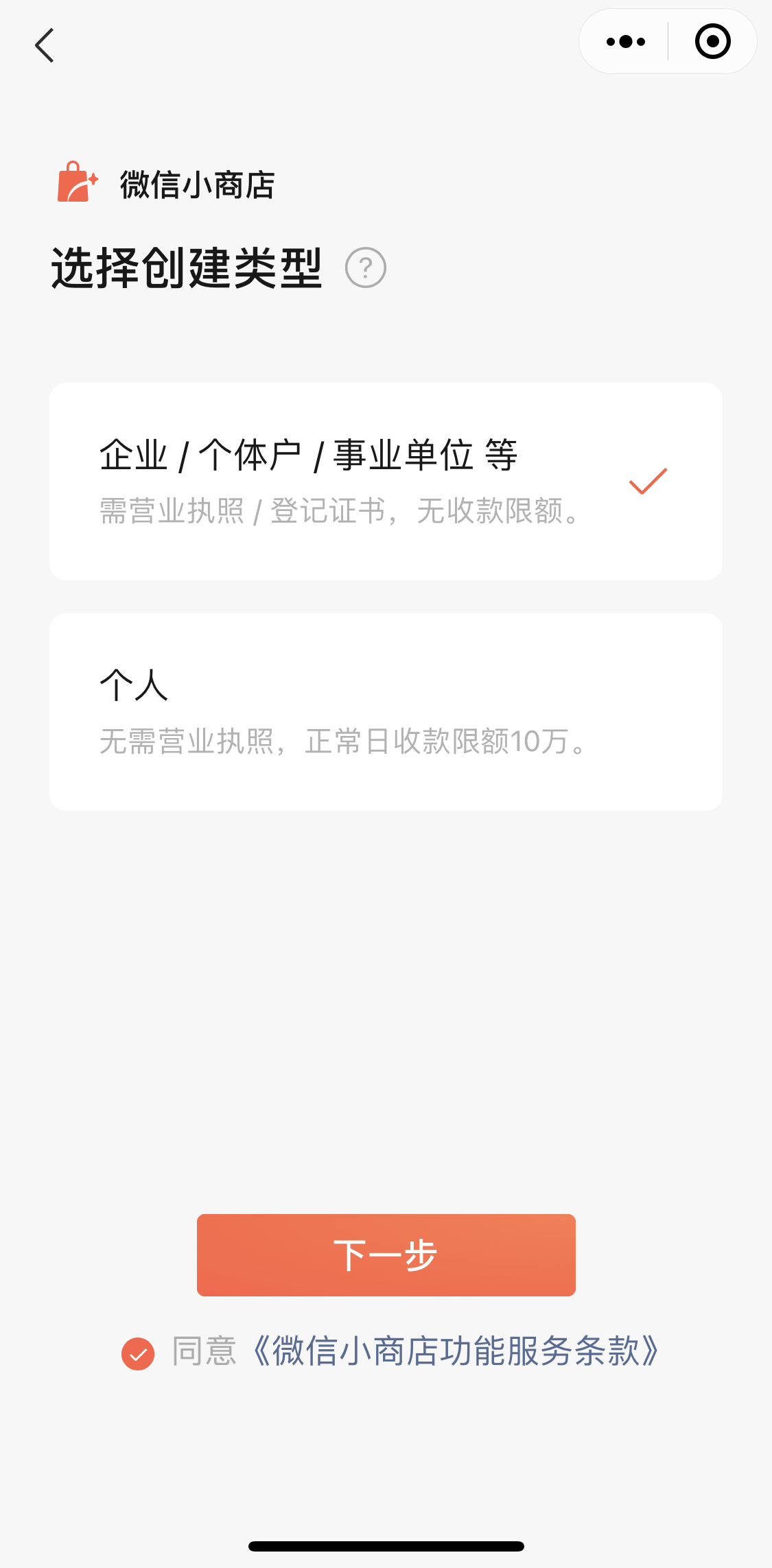 4、商家点击“快速开店“按钮,长按识别小程序码,选择“企业/个体户/事业单位等“,勾选服务条款并点击”下一步“按钮;
