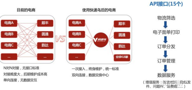 目前为止,已有各大商家、电商平台、仓储、清关公司、ERP、WMS、TMS、CRM、快递柜等至少十万家发货方在使用快递鸟API对接解决方案,包括发货管理、智选物流、电子面单、货物在途监控、货款金融等全流程物流服务。另一端物流服务方也有全球四百多家物流快递公司与快递鸟完成接口对接。电商平台蘑菇街、拼多多、国美、网易考拉接的就是快递鸟的接口,也有很多ISV服务商(比如网店管家、商派、E店宝)也对接的快递鸟API接口。